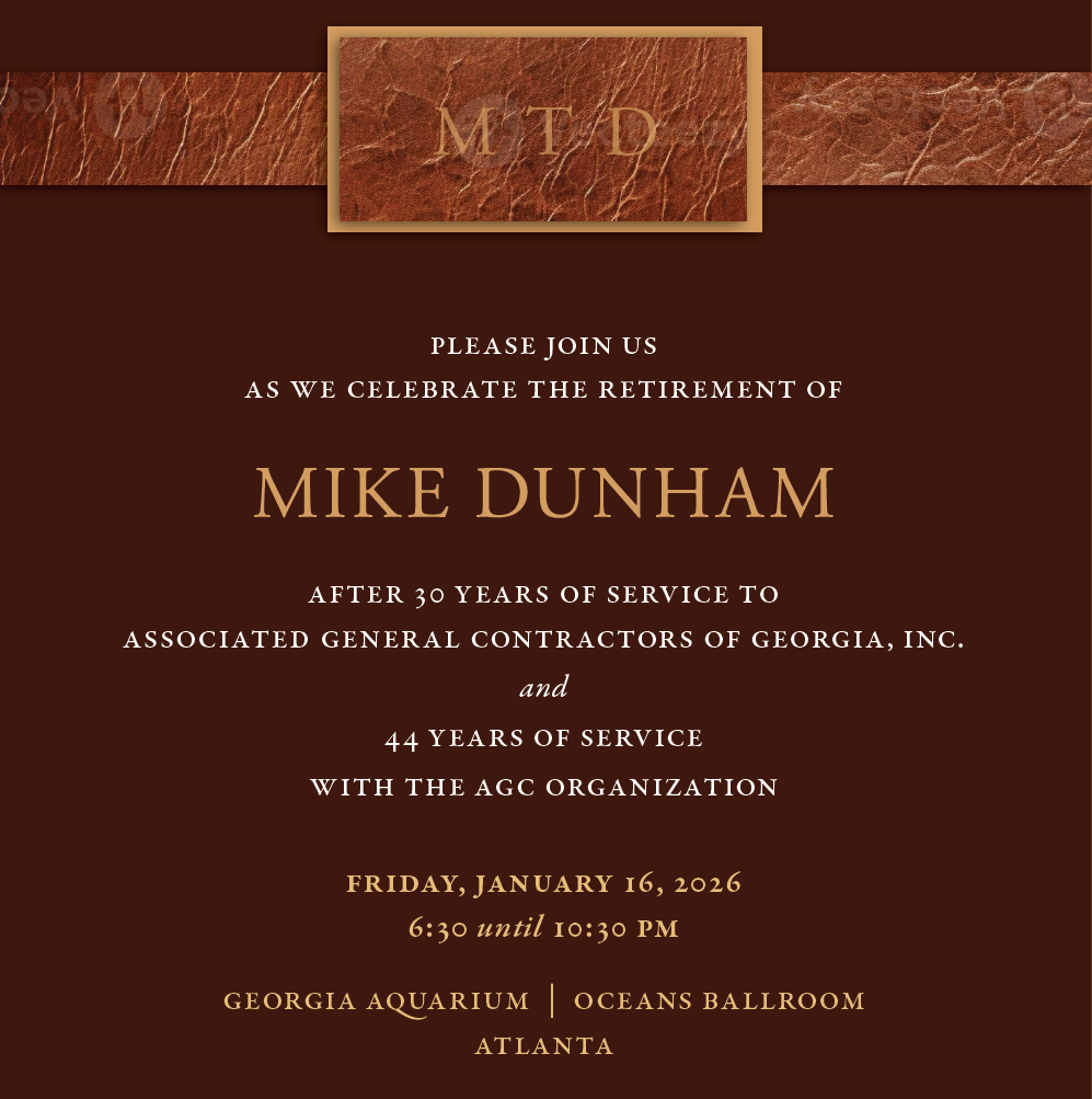 As a way to show appreciation to Mike's dedication to serving the state's construction industry for many decades, the AGC Georgia team appreciates your team's consideration of serving as a sponsor of this event with proceeds going to the AGC Georgia Foundation that will be used for workforce development initiatives to help bring more awareness with young people about careers in construction. In the coming days, we'll have a printable registration form for attendees and sponsorship information available.