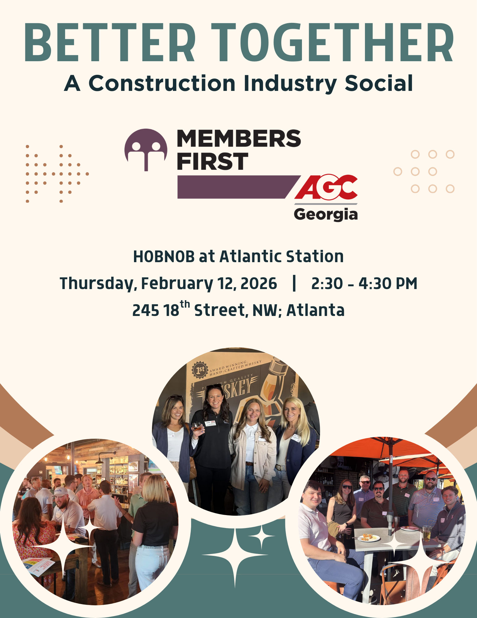 Our team is excited to offer this relaxed opportunity for members from all facets of the construction industry to connect and learn how their respective company can collaborate with fellow members. This event is part of our Members First series that will visit HOBNOBs around metro Atlanta throughout 2026. Please make plans now to break away from your jobsite or office early on